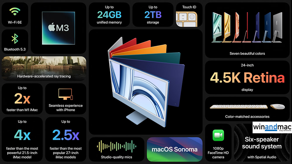 當初M2新晶片發佈後,iMac竟然沒有任何新款,長時間仍然使用M1系列。不過,今日蘋果發佈會中,終於發佈了新的iMac系列,採用M3系列的晶片,售價由HK$9999起跳,由11月7日起發售。其機身外型與過往幾乎沒有分別,最令人失望的是,鍵盤等仍然是使用Lightning。此外,用家目前只能選擇M3晶片,不能像MacBook Pro般選擇M3 Max較快的晶片升級。