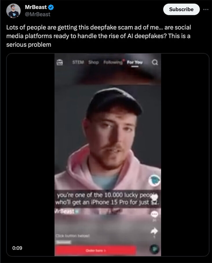 用AI整Deepfake影片已經不是新鮮事,不過近年來AI人工智能愈來愈易用,Deepfake影片就愈來愈多。著名YouTuber MrBeast最近就在社交平台表示,網上有一段Deepfake他的廣告影片,在抖音上廣傳,宣稱MrBeast將會送出多部iPhone 15 Pro,要求網民到指定網站註冊並交出個人資料。由於MrBeast過往在YouTube多條影片中都相當大手筆,不少人都以為這條影片是真。