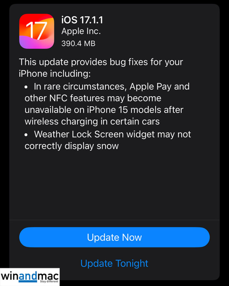 蘋果於數小時前推出iOS 17.1.1、iPad OS 17.1.1、watchOS 10.1.1、macOS 14.1.1、macOS 13.6.2等相關更新,今次只是針對臭蟲更新,包括減低Apple Watch等電池耗電太快、iPhone 15使用汽車上的無線充電後無法正常使用Apple Pay、天氣Widget等問題。小編在備份好資料後已作更新,似乎暫時沒有太大問題。