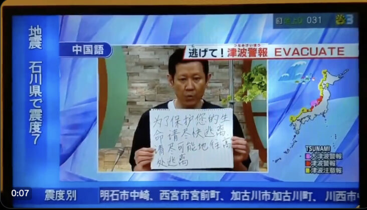 每逢日本發生大地震,中國總有大量網民拎番當年戰爭的事情來講,然後為日本發生大地震感到高興。於今年2024年一開始,日本石川縣能登半島發生規模達7.6級強烈地震。有網民發現日本電視台有相當貼心的舉動,找人以簡體中文在鏡頭上舉起相關文字提示,擔心中國人因為聽唔明日文而延誤了逃生。網民都忍不住叫中國人學習一下,「知道什麼是文明了吧?」。