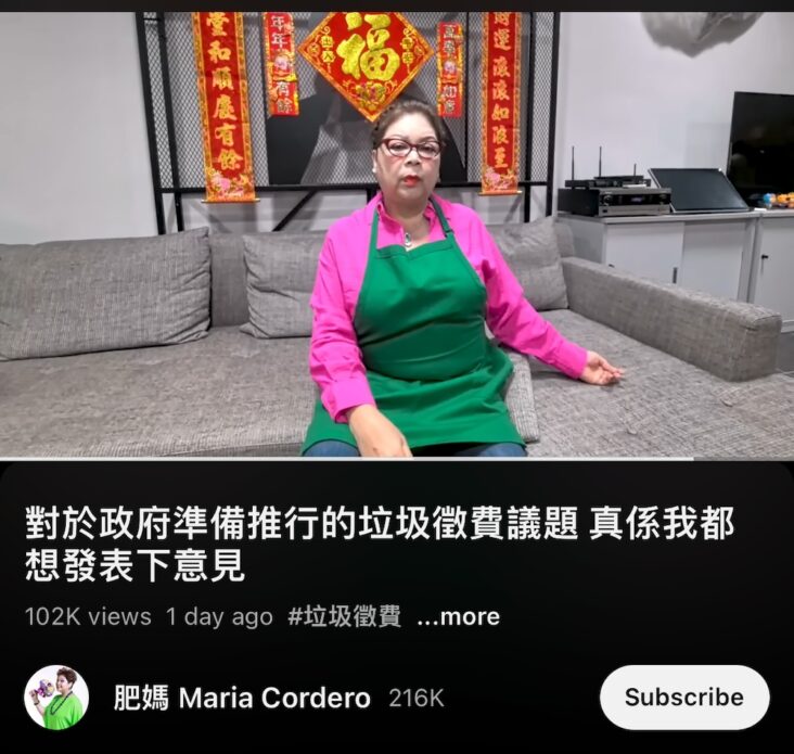 港府近日推垃圾徵費,唯市民大為不滿,結果有關政策推遲四個月才強制執行。一向支持中國的肥媽Maria Cordero,近日拍片大罵香港政府,片段一開始就大鬧政府垃圾癡線。她斥很多人一間屋只得200幾尺,「點分(分開幾種垃圾作回收)者?」。肥媽認為每天應有四間不同的車收四種不同的垃圾,「好似外國咁,你分嫁嘛!」。肥媽在片段中十分激動,並斥「點可以咁嫁者」,又指天下大亂,又稱「根本就無政策」。她亦指要求市民買特定膠袋裝垃圾,其實係唔環保,因為買多咗膠袋。