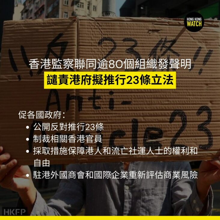 超過80個組織發表聲明,強烈批評香港政府計劃實施《基本法》第23條的立法工作,呼籲國際社會對侵犯人權的官員實施制裁。這些組織,包括以英國為基地的人權組織香港監察及其他主要由海外香港人組成的團體,於星期一共同發表了聲明,譴責《基本法》23條。