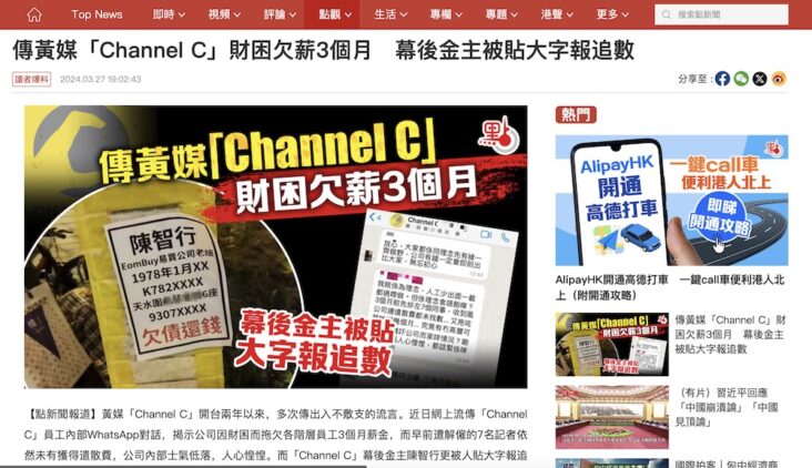 黨媒大公旗下的點新聞,日前有報道稱Channel C財困而拖欠各階層員工3個月薪金。winandmac記者今早向記協主席和Channel C多媒體製作主任陳朗昇查詢,他以WhatsApp回應本站記者時表示,大部份人出糧都準時,並指「出糧時間係唔係太準,不過受害人係我」。他澄清,離職的同事並不是被解僱,他們全部都是自己辭職,並已在本月拿回所有代通知金。