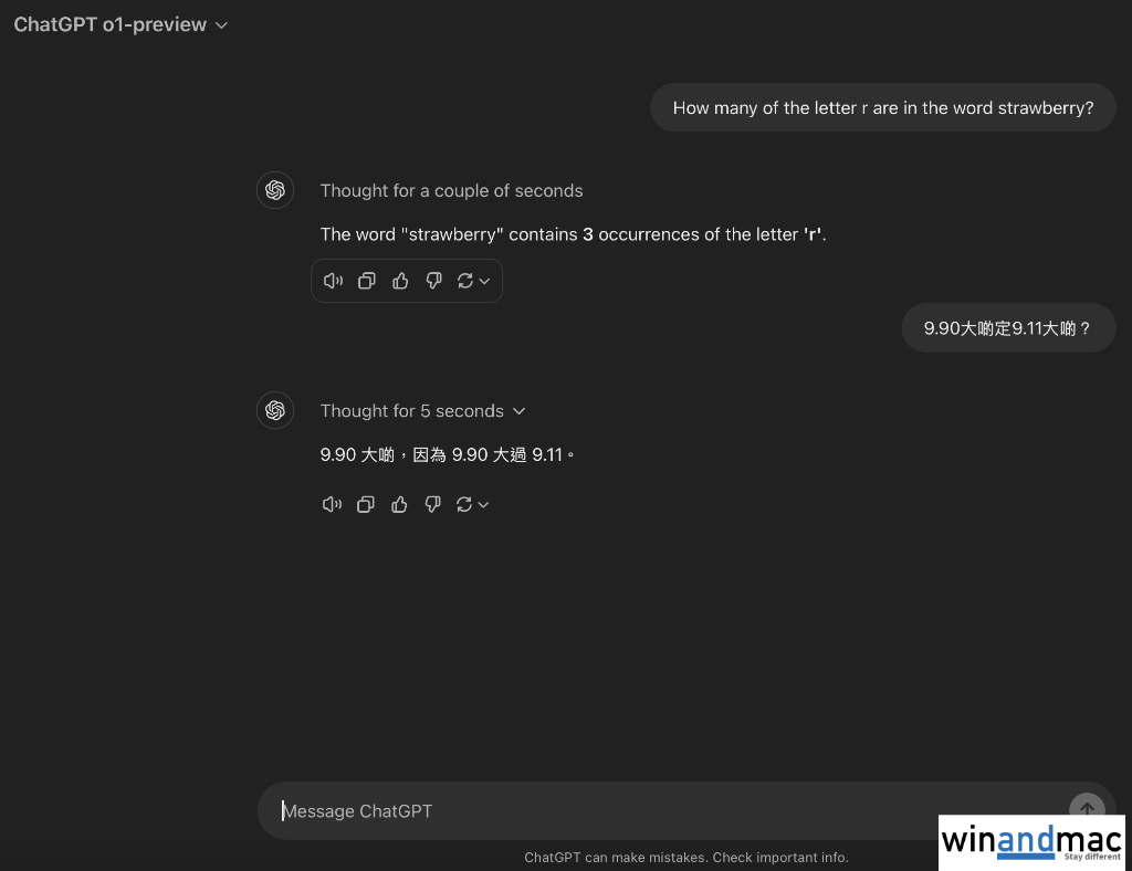 OpenAI於今天正式發佈ChatGPT o1-preview及o1-mini,亦即傳言中Strawberry的新模型。o1-preview最令人震驚的地方,是AI可以「思考」清楚後才回答。雖然每一次問問題時,回答時間較長,但準確度提升了不少,尤其是解決複雜的數學或寫程式問題。至於一些經典AI無法回答正確的問題,包括Strawberry有幾多個r等,ChatGPT o1-preview也可以正確回答。OpenAI研究主管Jerry Tworek向傳媒表示,o1-preview的訓練方式完全不同,並且用全新邏輯。