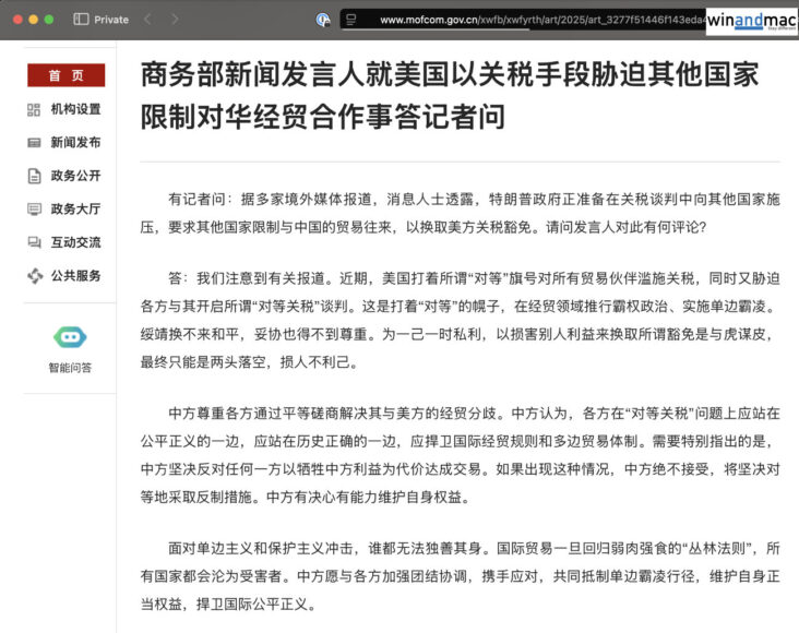 中國商務部於星期一(21日)發佈文章,與美國關稅手段威逼其他國家,限制對華經貿合作的記者問答內容有關。問題一開始提到,美國特朗普正準備要求其他國家限制與中國的貿易往來,以換取美國關稅的豁免。中國商務部發言人回答時,強調各方在對等關稅問題上應站在公平正義的一邊,應站在歷史正確的一邊,應捍衛國際經貿規則和多邊貿易體制。