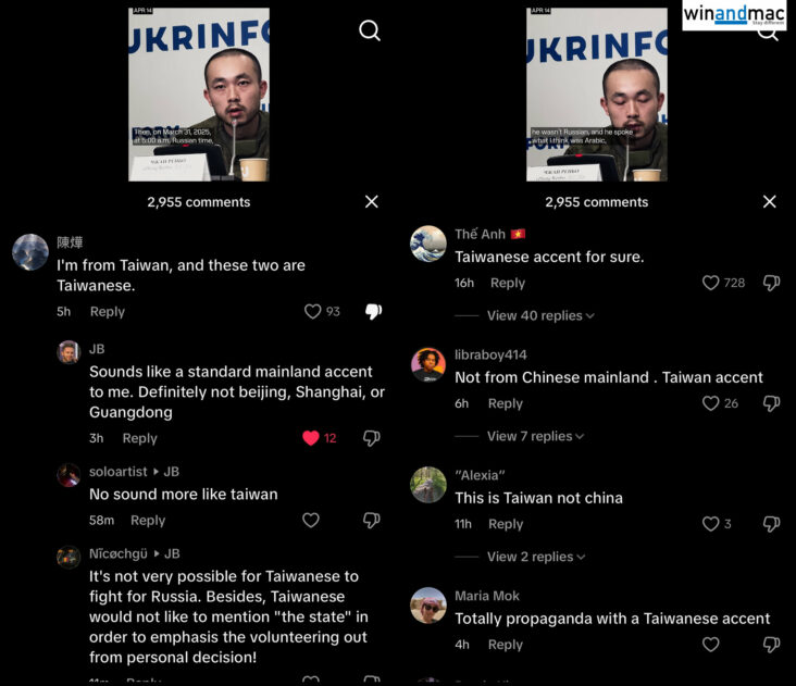 兩名中國戰俘是以普通話回答,由烏克蘭當局即場翻譯,烏克蘭官媒與獨立媒體都有報道。很多中國人翻牆立即湧入烏克蘭官媒與烏克蘭多間獨立媒體,不停強調兩名戰俘不是中國人,是來自台灣。更有人寫道「This is Taiwan not China」,亦有人斥烏克蘭官方作假新聞,強調「明明這兩位戰俘是台灣口音」。本站記者在國際版抖音上發現有極多類似強調戰俘來自台灣的留言,不少留言的戶口似乎都是新開。