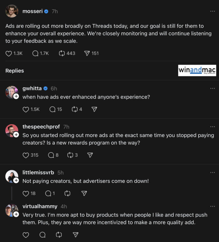 Adam Mosseri發佈有關消息時,提到他們的目標是提升用戶整體體驗。可是,即時被人串,質疑搵錢就搵錢,「什麼時候廣告可以提升體驗」,亦有人批評,Threads吸廣告但拒絕向創作者分成。