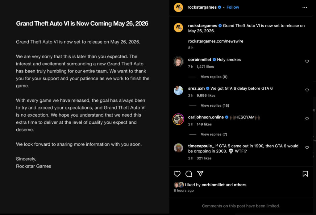 開發已經超過十年的GTA6,已經成為網上經典的meme。開發商Rockstar Games約一年前第一次發表GTA 6預告片時,曾提到GTA 6會在2025年推出。如今已經2025年,沒想到又再出現變數。Rockstar Games於數小時前在社交網絡正式宣佈,GTA 6將會在下年2026年5月26日推出,內文當然又係「確保遊戲質素達到玩家期望」等原因。