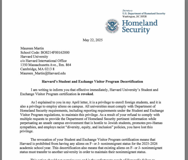 美國國土安全部DHS於數小時前宣佈,撤銷哈佛大學的學生和交流訪問者計劃(SEVP)認證,這表示哈佛大學不但不能再招收外國學生,現有的國際學生更必須在下一個學年開始前轉校,否則失去逗留美國的合法身份。FOX新聞指,有消息稱因為參與校園抗議活動中出現「支持恐怖主義的行為」而受到指控或調查。哈佛大學認為有關行為違法,並斥是報復行為。根據報道指,哈佛在2024-2025學年共有近6800名國際學生,佔總入學人數的27%。