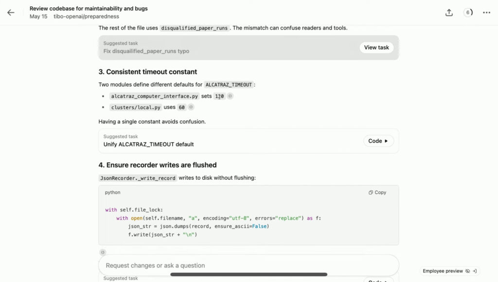 從官方發佈影片可以看到,用家可以建立一系列工作,例如檢查程式碼是否有臭蟲、建立新的PR、改善和重寫一些功能等,按執行後就能自動完成。程式設計員日後寫程式碼也可以變得進一步自動化,透過Codex減少人手操作。