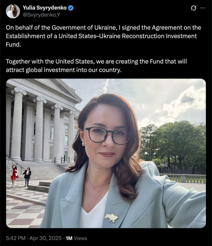 烏克蘭第一副總理兼經濟部長Yulia Svyrydenko早前在社交網絡表示,雙方已簽署了討論很久的礦產協議。有關協議將在烏克蘭設立聯合投資基金,以幫助烏克蘭重建。她本人亦親身到美國白宮,並與美國財政部長Scott Bessent共同簽署了有關文件。