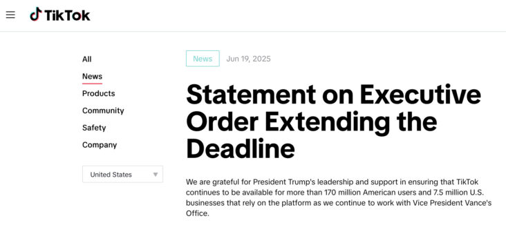 雖然每次推遲禁令其實都無乜法律準則,但似乎已經沒有太多人挑戰有關決定,抖音國際版亦感謝有關決定,並指將與美國當局繼續合作。白宮發言人Karoline Leavitt強調,特朗普延長禁令是因為想達成協議。她亦指,特朗普想保障美國抖音用戶的私隱,「特朗普相信我們可以做到」。