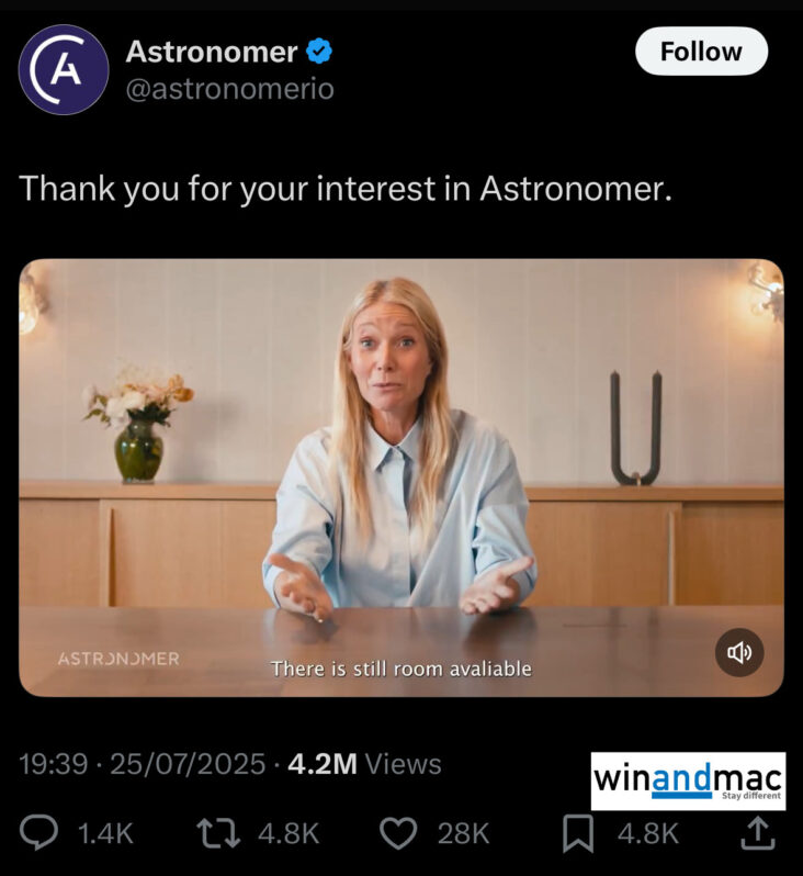 Astronomer早前面對公司醜聞,當時的CEO Andy Byron與人事部Kristin Cabot,在Coldplay演唱會被人捉到黃腳雞。Andy Byron後來已正式辭職,日前最新報道指Kristin Cabot亦於當地時間星期五正式辭職。面對有關醜聞,Astronomer發表過多篇聲明,強調公司的價值觀與問責方面樹立榜樣。雖然如此認真,但數小時前他們發表新廣告,由著名美國演員Gwyneth Paltrow擔任「臨時發言人」,她一開始便說「喺非常臨時嘅基礎上代表Astronomer嘅300多名員工發言」。