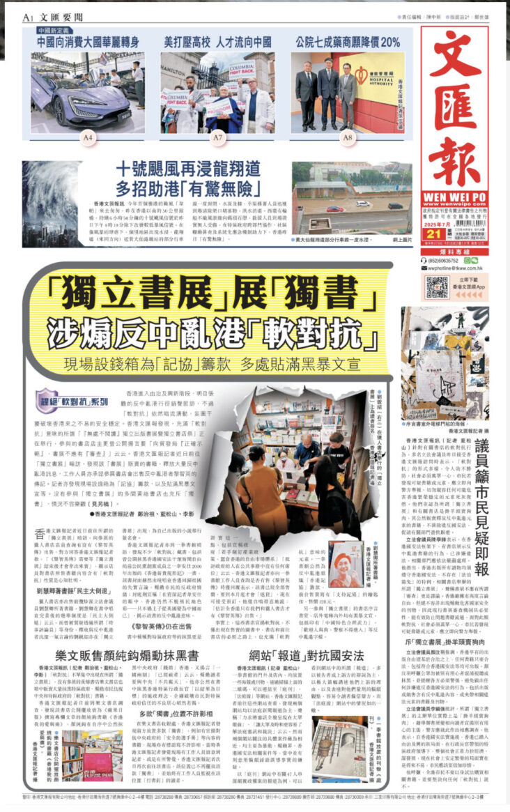 在香港經濟愈來愈差,大部份人都選擇北上消費的時候,今年的書展亦不如以往般熱烈。不過,香港文匯報似乎嫌香港死得唔夠勁,竟然頭版報道稱「獨立書展展獨書」,以「趕絕軟對抗」的系列作長篇「報道」。當中針對獵人書店,亦提到有攤位接受預訂《黎智英傳》等所謂「問題」。當中就算較為溫和的劉慧卿的書也被針對,而沒有攤位的「庭刊」與「法庭線」網站也被批評,全是因為有書店有相關QR Code連結至相關網站。文匯報所謂的報道亦有提到樂文書店,批評其出售所謂「獨書」。