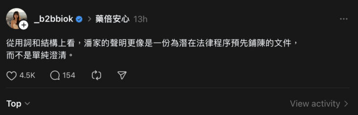 聲明公布後,網民對潘家的說法感到震驚,認為在女兒明顯涉嫌請槍的情況下,反而將矛頭指向揭發真相的人,根本就是轉移視線。鄭曦琳亦有在Threads談論有關聲明,其中一篇文章稱「從用詞和結構上看,潘家的聲明更像是一份為潛在法律程序預先鋪陳的文件,而不是單純澄清。」。