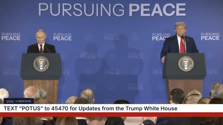 特朗普與俄羅斯總統普京今日在美國阿拉斯加會面,討論烏克蘭戰爭議題,會談歷時兩個半小時,最終未有任何共識。會後兩人共同會見記者,互相讚賞對方,並宣稱對和平的承諾。特朗普在會後記者會中,連續講了多次「Thank you very much」。雙方在記者會中分別發言後,並沒有接受任何記者提問,亦完全無提到兩個半小時中,雙方究竟傾咗啲乜,或有任何策略,但他們都稱見面十分有用(productive)。特朗普僅表示,目前仍存在「少數幾個關鍵問題」,他更說未有協議,就係未有協議。(no deal until there is a deal)。