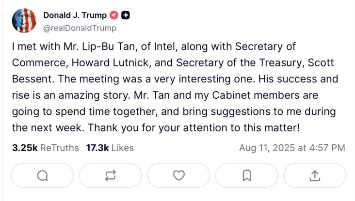 美國總統特朗普今日對Intel行政總裁陳立武(Lip-Bu Tan)的態度上,出現明顯轉變,突然180度大轉彎。上星期,特朗普在社交平台Truth Social發文,要求陳立武立即辭職,指控陳立武高度存在利益衝突。該言論源於共和黨參議員Tom Cotton對陳立武與中國的關係提出質疑,包括他在中國的投資,以及其曾領導的益華電腦(Cadence Design Systems)向中國軍事院校提供服務。