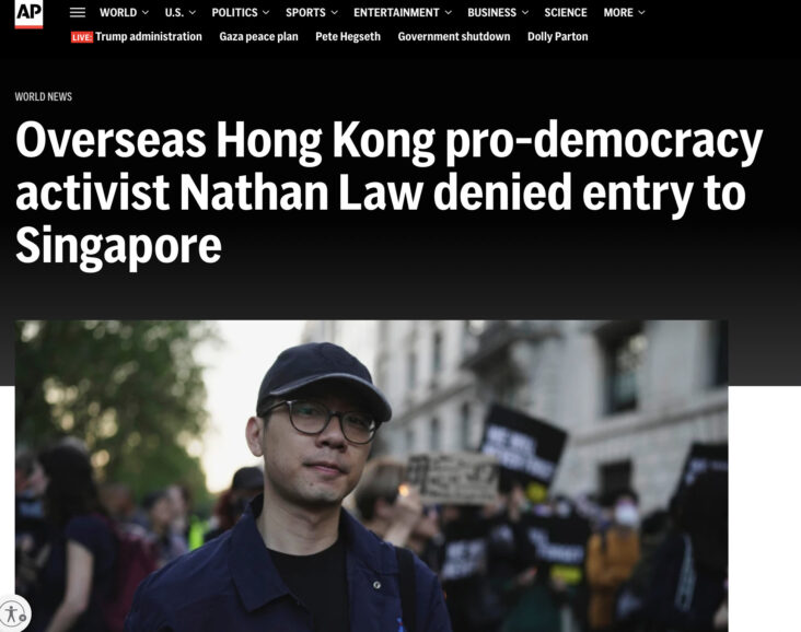 流亡海外的羅冠聰於剛過去星期六日,抵達新加坡準備出席一場閉門活動,但最終被拒絕入境並遣返美國。他在聲明中指,雖然事前已獲新加坡批出簽證,但落機後即被邊境人員扣查4小時,其後接獲通知不得入境,並被轉送到一個疑似用作扣留被驅逐人士的設施,直至翌日早上登機返三藩市,全程約14小時。他質疑事件涉及政治考慮,但未能確定是否與中國有直接或間接關聯。事件發生後,外國有不少傳媒報道有關事件。