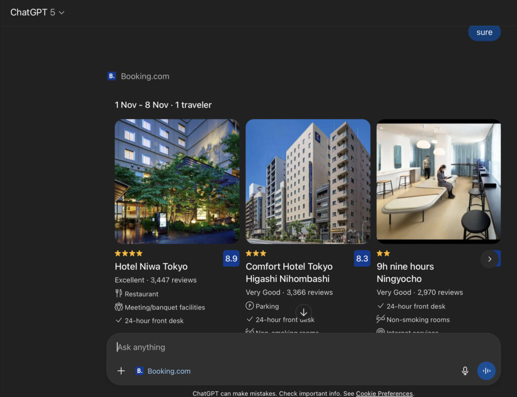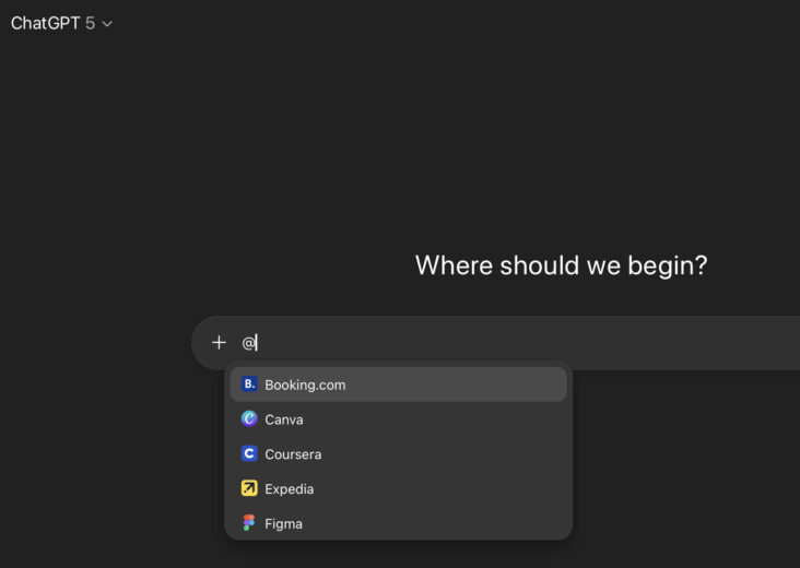 用戶只需在ChatGPT對話中輸入應用名稱就可以啟動相關功能,例如要求「Spotify幫我準備星期五party的播放清單」,系統就會即時顯示操作介面。像上圖般,用戶只要輸入@Booking.com,就可以直接在ChatGPT內啟動相關程式,並直接使用。ChatGPT亦會按對話內容自動推薦合適的內容,當用戶討論買樓時,系統可能建議使用Zillow在地圖上查看符合預算的樓盤。用戶亦可以要求Canva將大綱轉化為簡報,或者在看Coursera課程時請ChatGPT解釋影片內容。