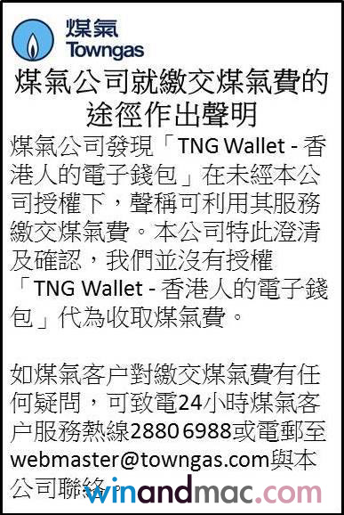 TNG Wallet出事鳥?  煤氣公司發聲明指未經授權
